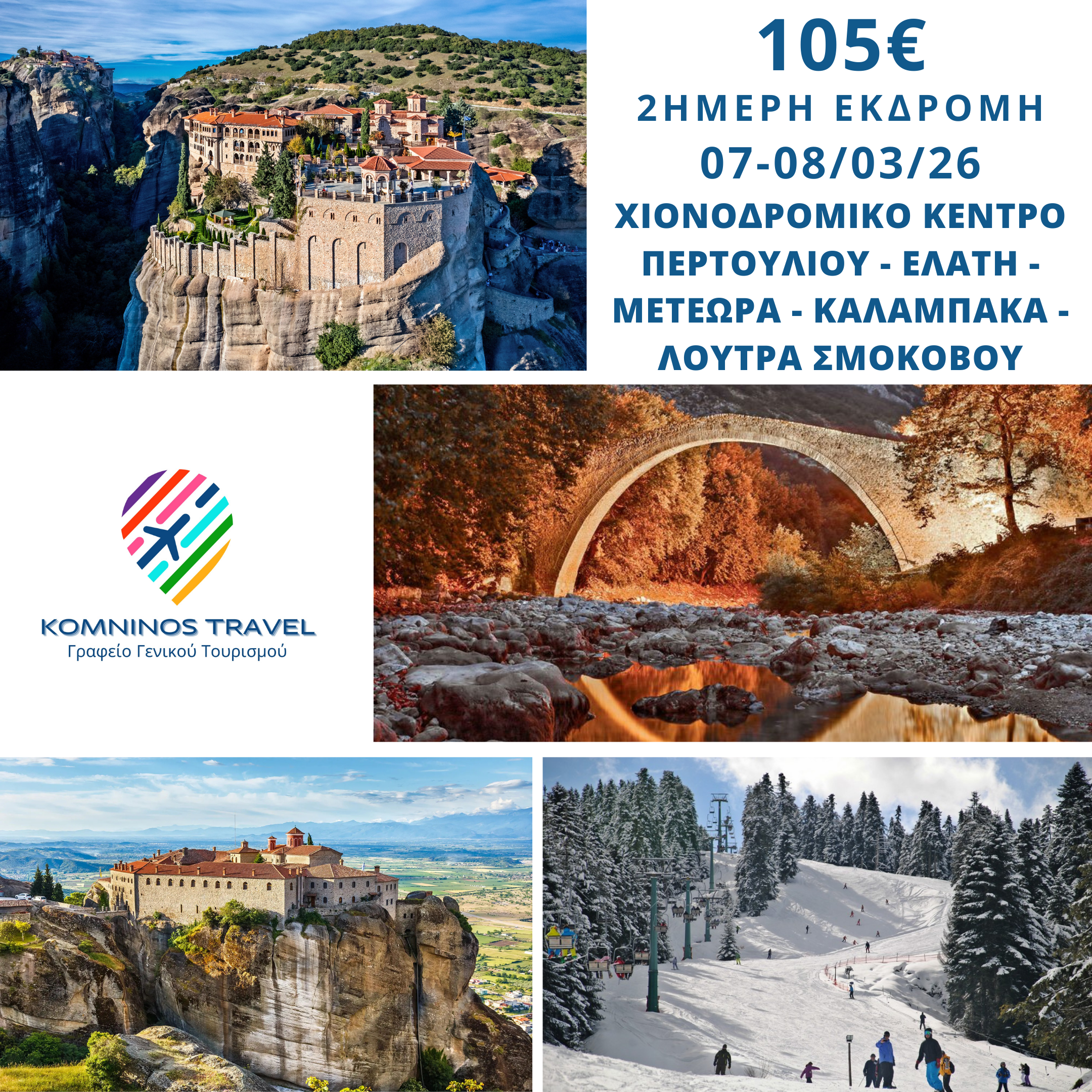 07-08/03/26 2ΗΜΕΡΗ ΕΚΔΡΟΜΗ ΧΙΟΝΟΔΡΟΜΙΚΟ ΚΕΝΤΡΟ ΠΕΡΤΟΥΛΙΟΥ – ΕΛΑΤΗ – ΚΑΛΑΜΠΑΚΑ – ΜΕΤΕΩΡΑ – ΛΟΥΤΡΑ ΣΜΟΚΟΒΟΥ