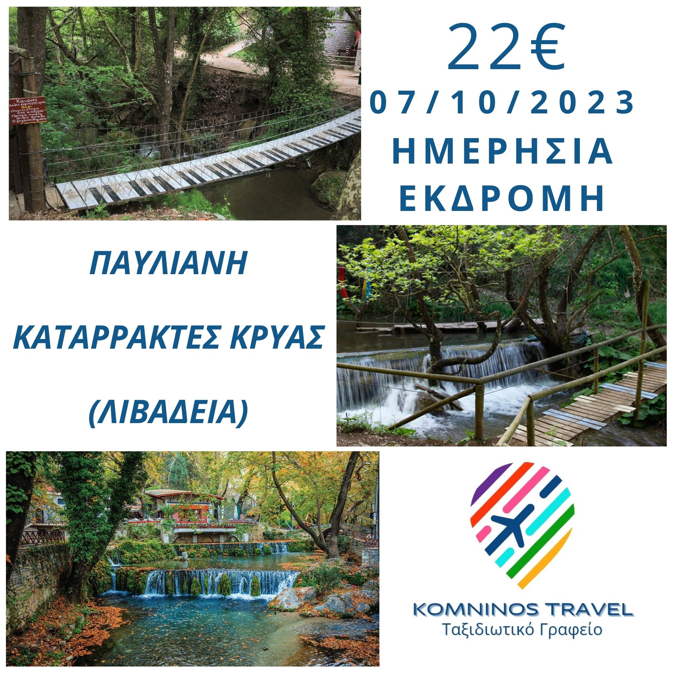 Αναχώρηση νωρίς το πρωί στις 07:30 από το Πέραμα (Πλατεία Ηρώων) και στις 07:50 από τον Πειραιά (Σταθμός ΗΣΑΠ) για έναν προορισμό, που είμαστε σίγουροι ότι θα σας μαγέψει. Το υπέροχο πάρκο αναψυχής της Παύλιανης και τους καταρράκτες Κρύας στη Λιβαδειά.